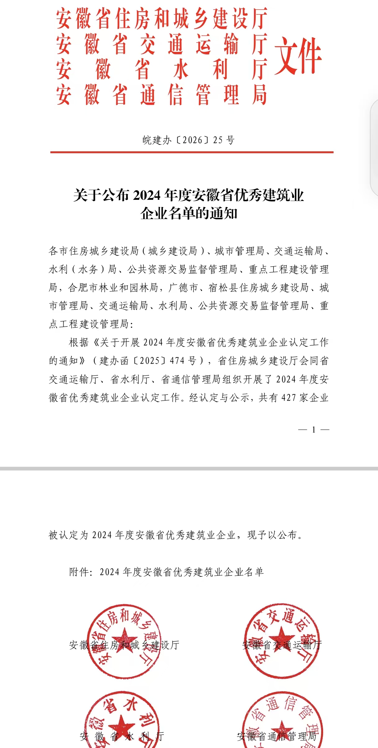 热烈祝贺:淮南市建发建设工程检测有限公司荣获2024年度安徽省优秀建筑业企业(工程质量检测类)荣誉称号! 这是公司继2021年斩获首届认定后,再度蝉联此项殊荣,也是淮南市工程检测机构中唯一获此荣誉的单位,实力再获省级权威认可。